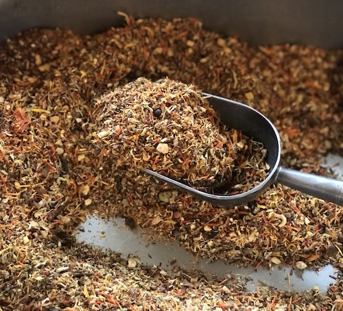 Tisane Blends include S.A. Rooibos, Honeybush, Licorice, ginger, cardamom , clove ,Calendula, Saffron, Peppermint